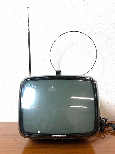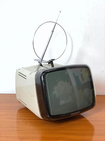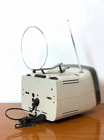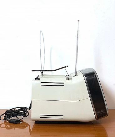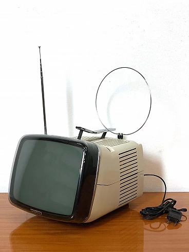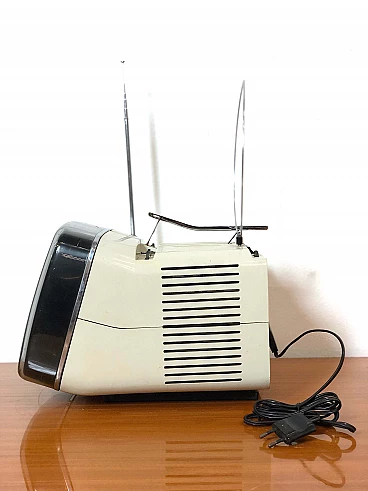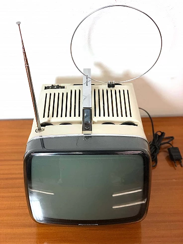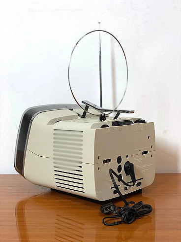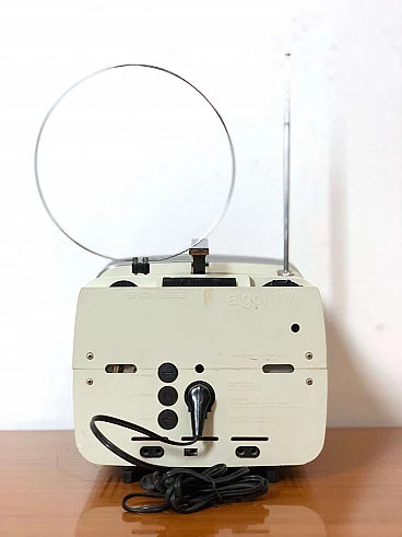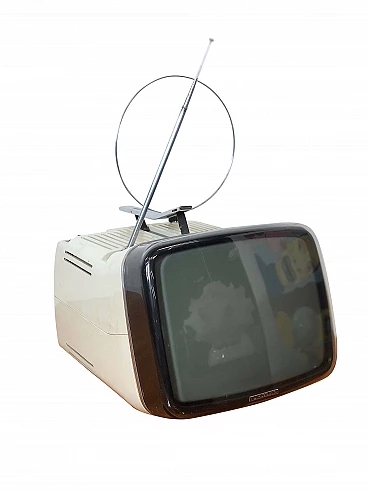 The ALGOL 11 (First Series) is an unusual 11-inch portable transistor television. In 1964 Marco Zanuso and Richard Sapper designed this transistor television Brionvega model Algol 11 and marketed by the Milanese company Brionvega. It is characterized by the rounded and tilted screen (Zanuso for this reason will compare it to a small dog looking up at his master) and the removable metal handle The device is made of ABS WHITE plastic material with rounded profiles. The kinescope has a 90° deflection to allow an easier vision. In the upper part there are the controls for the power, the adjustment of volume brightness and contrast, the selection of VHF and UHF preset channels. On the back of the TV you have the sockets for connecting to the mains, the internal rechargeable battery, the VHF and UHF channels, for an external speaker and the selector for the antennas.The ALGOL 11 is a world icon of industrial design, is exhibited in the most important museums of contemporary art, even the MoMa in New York has a specimen. Perfectly functional, there are some small signs caused by time. PERFECT CONDITION Measurements: Width cm 28-Depth cm 36-Height cm 26