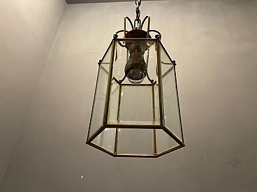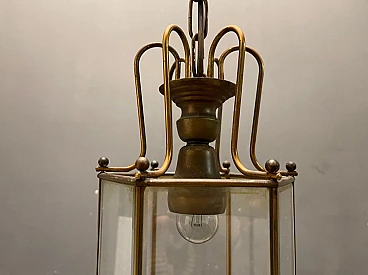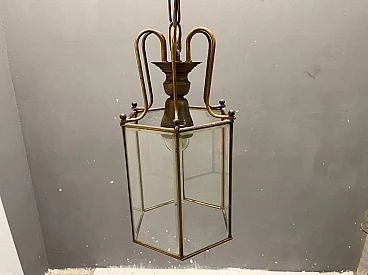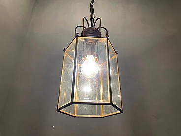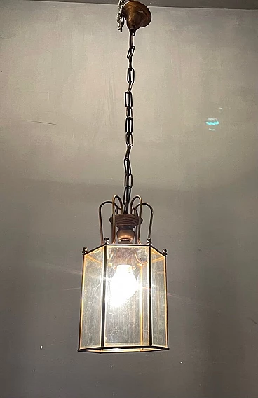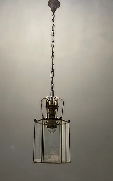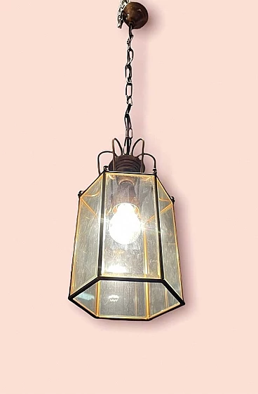 Bronze and glass lantern. Height without chain and ceiling canopy 36 cm. Height with chain and canopy 90 cm. It has 1 light. Requires E27 bulb. New wiring installed compatible with UK, Europe, USA