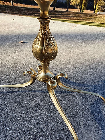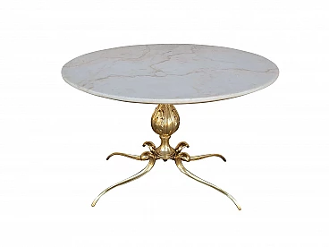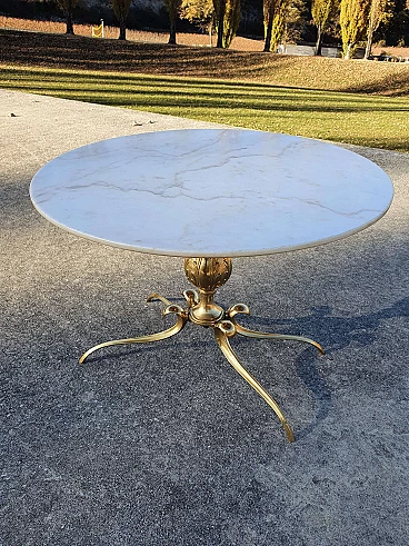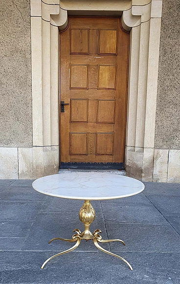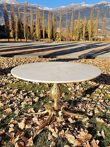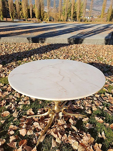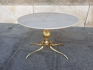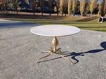 Here we have a beautiful and rare round coffee table made in Italy in the 1950s. The table rests on bright gilt brass legs and its top is made of precious cream marble. The brass base is beautifully decorated in Art Nouveau style with a leaf motif. Despite its weight (18.5 kg) it feels very light and delicate. It would be perfect in a glamorous interior or as a stylish and bold accent in a modern living room.