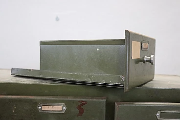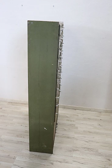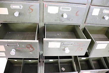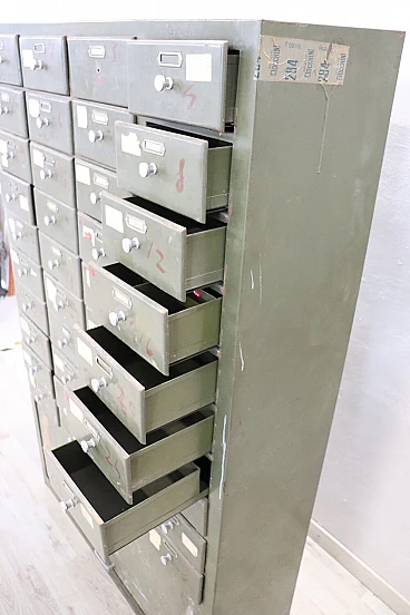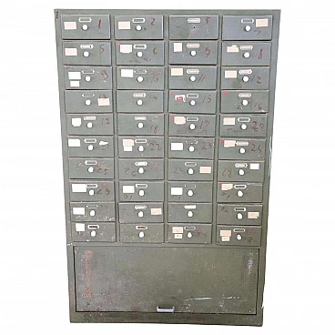 Particular industrial style office chest of drawers circa 1940s in metal. Equipped with forty drawers and a larger compartment at the bottom. There are widespread signs of wear and a missing knob. We advise you to look closely in detail all the attached photos. Proposed at an excellent price negotiable, we invite you to send us your proposals for purchase we will evaluate with pleasure. Professional packaging, insured shipping with couriers, delivery by appointment only street level, no porterage to the floors.
