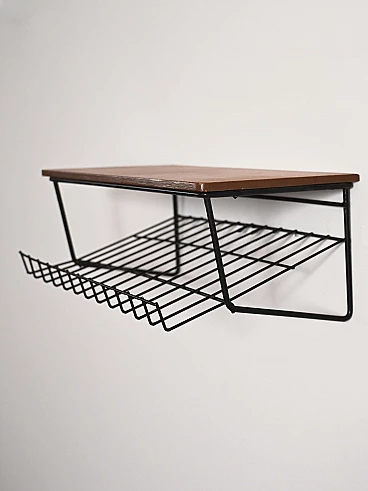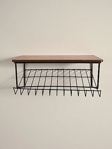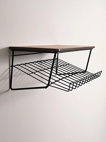 Bedside table/hanging console table in teak and metal. Consisting of a simple teak wood shelf with rounded corners and a metal magazine rack. Original to use as a suspended bedside table. Good condition. Please pay attention to the pictures.