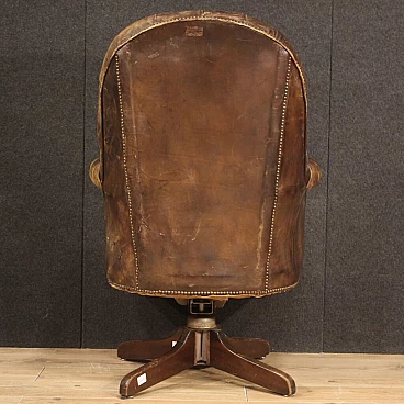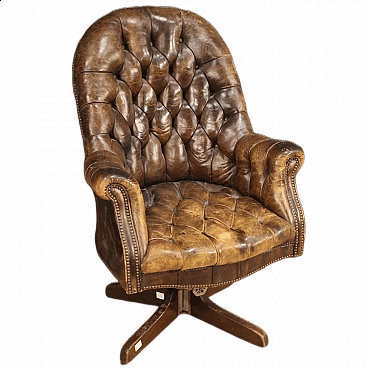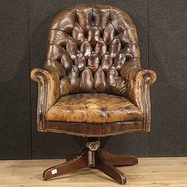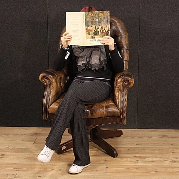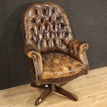 Fabulous early 20th century English armchair. Leather upholstered furniture (seat, armrests and capitonné back) in fabulous patina with original wood and iron base (see photo). Recliner with original Hillcrest mechanism (see photo) to be serviced for maximum safety. Furniture that has undergone structural restoration work under the seat (see photo). Finished centre armchair which shows some signs of age and small tears on the left side (see photo). A piece of furniture of exceptional quality and beauty, ideal for inclusion in a salon or study, for antique dealers and interior designers. In fair condition, defects on the left side. Height at seat 50 cm.