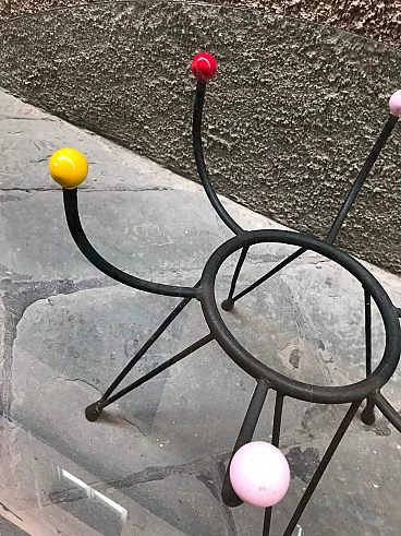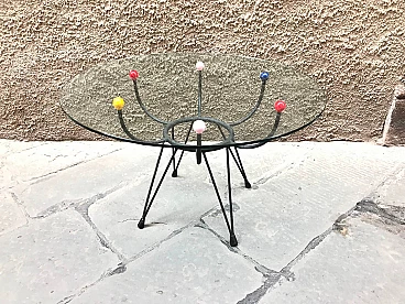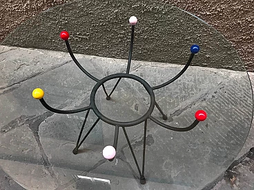 Coppia di tavolini Roger Nelson struttura in metallo con pomelli colorati, piano tondo in vetro trasparente.