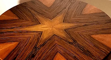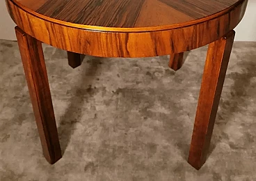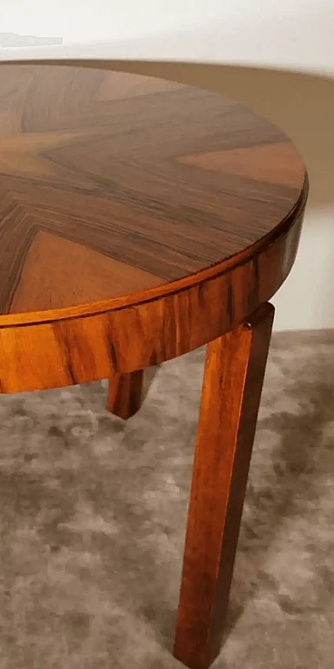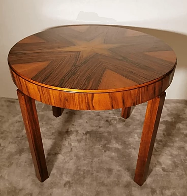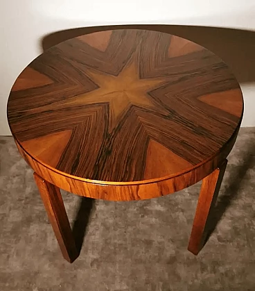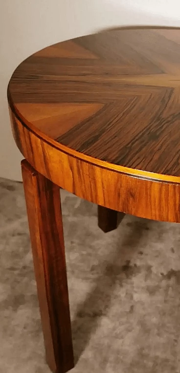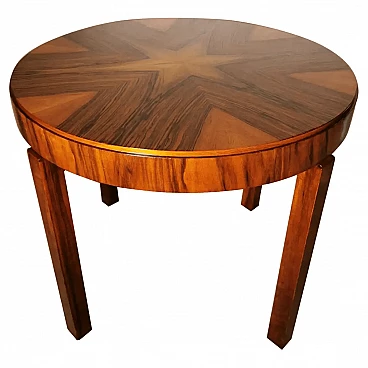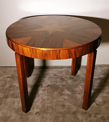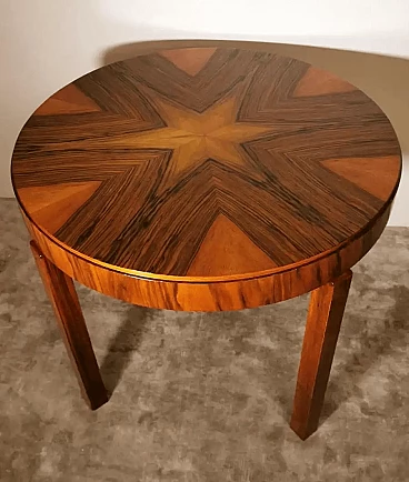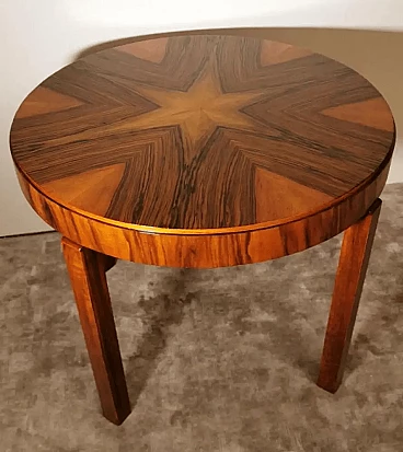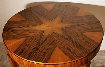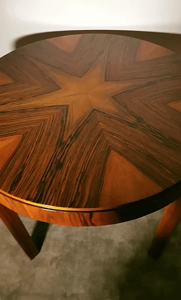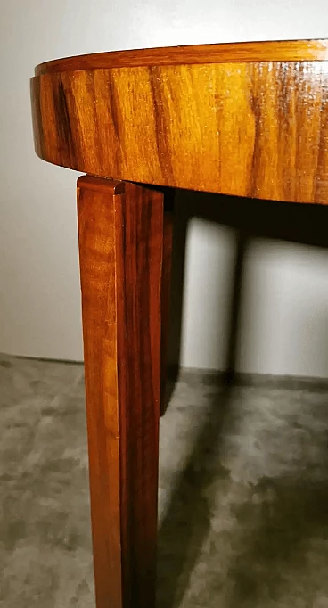It has a very clean and linear shape, aesthetically refined and pleasant, the round top is supported by solid legs. The table was made in a workshop in Lissone (Monza-Brianza-Italy) between 1930 and 1935. The craftsmen have used, for the top, a veneer with a star pattern with feather walnut burl that enhances the colors, the flaming and the grain of this beautiful wood. The entire wooden structure has been completely restored by hand by our team of craftsmen and the object is in excellent condition.