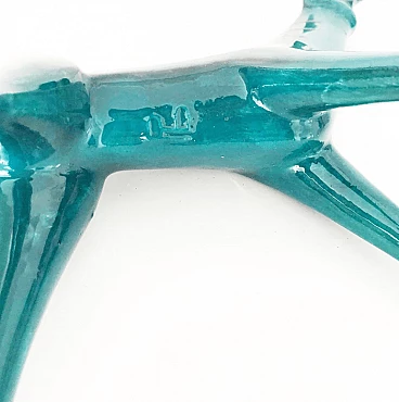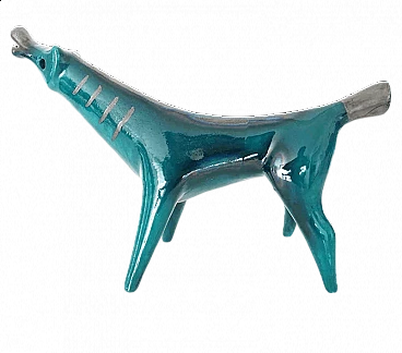 Dog-shaped sculpture in glazed ceramic, petrol green and platinum, created and signed by Roberto Rigon in the 1950s.