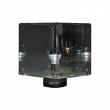 The Nucleo division was founded to integrate the Sormani production with accessories. PRISMAR, here in its PICCOLA version, is a mirror glass table lamp "mirrorpan" of the renowned series of lamps designed in the early seventies by A.R.D.I.T.I. Group - Trassinelli, Gamberini, Mazzoni - for the division Sormani Nucleo, Italy. When it is off, it is a five-sided mirror, when on, it becomes a seductive sculptural lamp. Silver cap bulb. The A.R.D.I.T.I. Group was forty years ahead, having interpreted light itself as a sculptural element, rather than focusing on the lamp as a simple designed form. BT lamps and the Prismar series are exhibited in the best museums in the world.