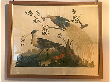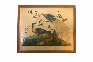 Stampa di Carlo Antonio Raineri raffigurante uccelli esotici entro cornice in legno. Disponibile l'intera serie, composta da 3 quadri.