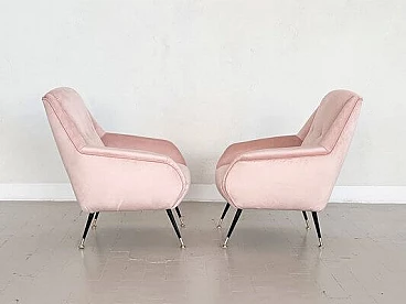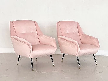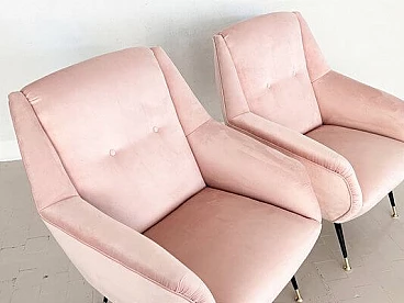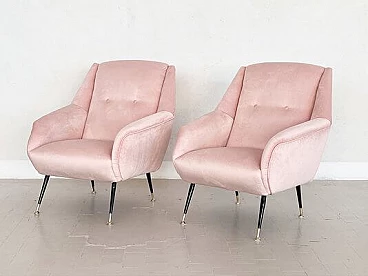 Elegant and beautiful pair of two original Italian armchairs or lounge chairs from the mid-1950s with black metal feet and polished brass tips.