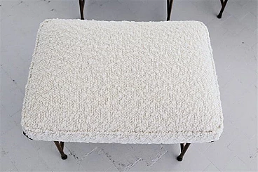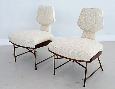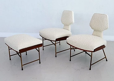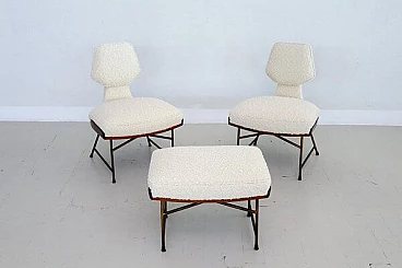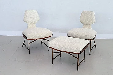 Pair of chairs and footstool in oak, metal and white bouclé, 1950s
