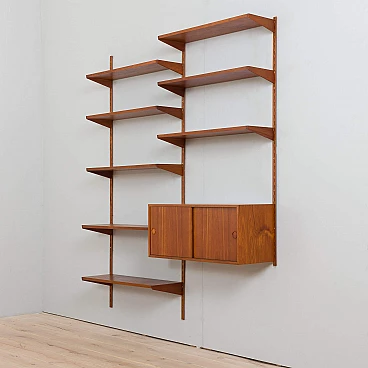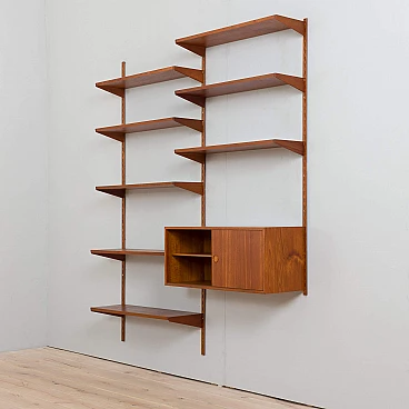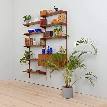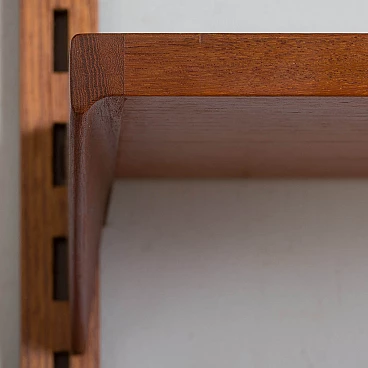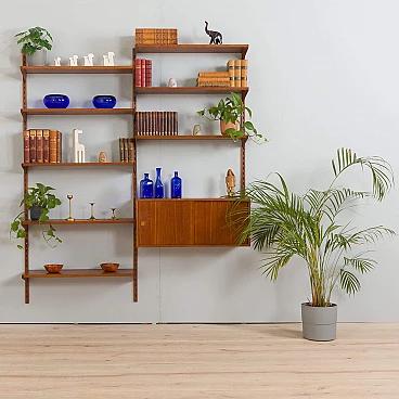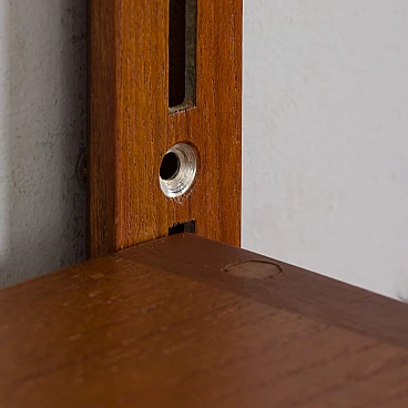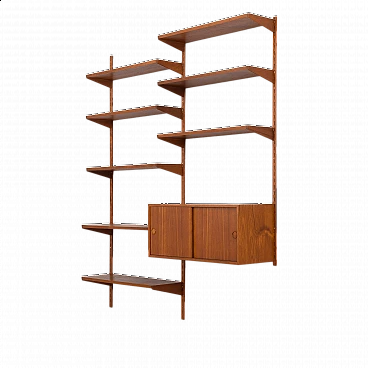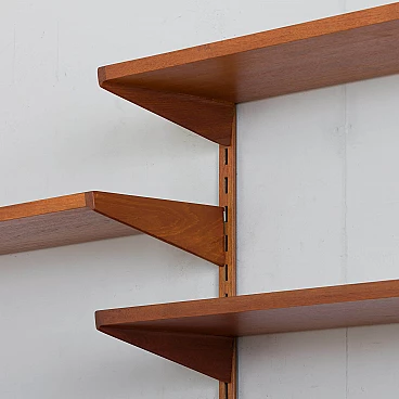 An elegant two-bay wall unit in teak designed by Kai Kristiansen in the 60s and manufactured by FM Mobler, validated by a label at the back. A very functional cabinet with adjustable shelf and an inside drawer with gray lining and eight shelves provide enough space for storage, books, and decorations. The wall unit features brilliant carpentry and rich teak grain. It's a great example of scandinavian carpentry skills from mid 20th century. This set consists of 6 shelves 24 cm deep, 2 shelves 28 cm deep, 1 cabinet with sliding doors H: 36 / W: 86 / D: 32 cm, 2 metal rails in teak veneer 200 cm long and one 157 cm long. All components are 86 cm wide and can be easily arranged upon one will, using a system of metal brackets fitting into the rails. The set is in great original condition with minimal signs of wear.