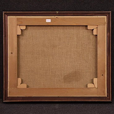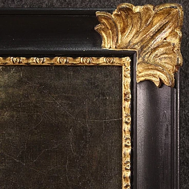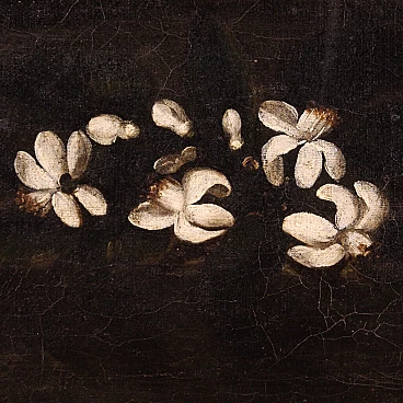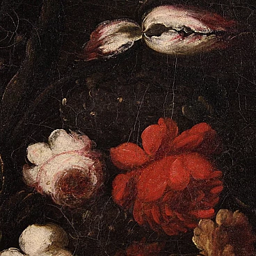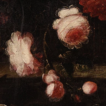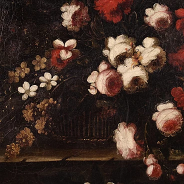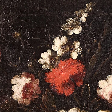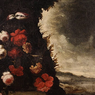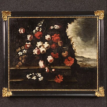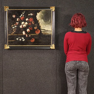 Oil on canvas depicting a still life with flowers and a view in the background, first half of the 18th century. Carved, ebonized and gilded 20th-century wooden frame. The painting has recently undergone restoration: it has been re-stained, the frame has been replaced, and the color has been restored in several spots (see photos). Without the frame, the painting is 59 cm high and 72 cm wide. The work is part of a specular diptych: https://www.intondo.com/en/products/46381/decor/paintings-and-drawings/still-life-with-flowers-oil-on-canvas-early-18th-century