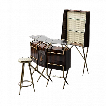 Bar cabinet with wood and brass structure and glass shelves, 1960s. Set consisting of three pieces: a bar counter with drawers and shelves, a bottle rack with glass shelves, and a stool made of fabric and brass. Height of the counter: 114 cm. Width of the counter: 134 cm. Depth of the counter: 46 cm. Height of the bottle rack: 180 cm. Width of the bottle rack: 92 cm. Depth of the bottle rack: 26 cm. Height of the stool: 79 cm. Diameter of the stool: 34 cm.