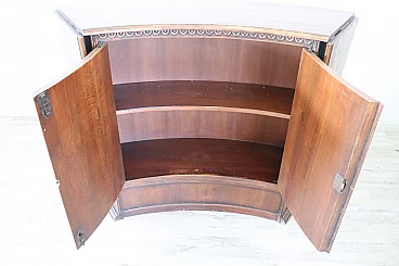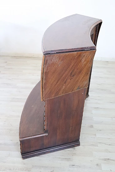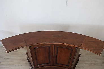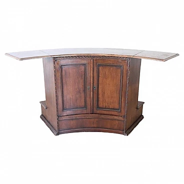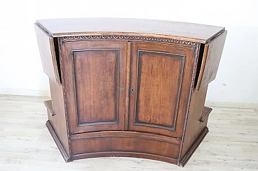 Bar counter dating from around the second half of the 20th century. Made of solid walnut. Equipped on the sides with two additional counter tops that can be lowered when not in use. The service side has a compartment for storing bottles and glasses. Good overall condition some signs of wear to the finish. However, we recommend you take a good look at all the attached photos in detail. Proposed at an excellent negotiable price, we invite you to send us your proposals for purchase and we will evaluate them with pleasure.