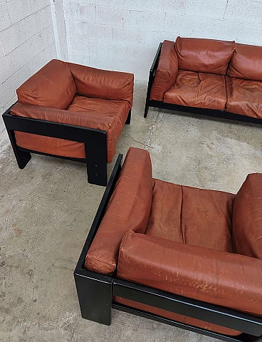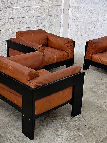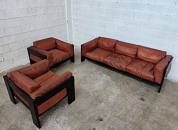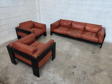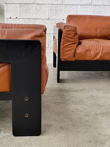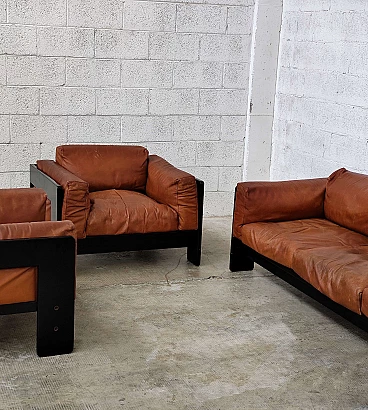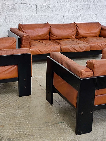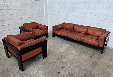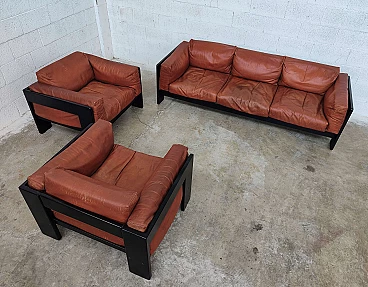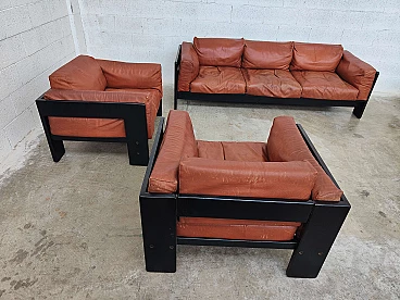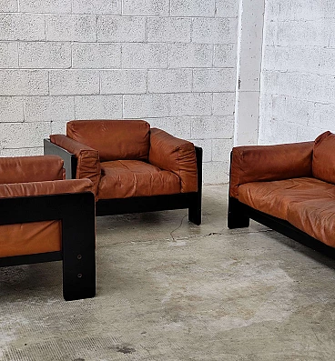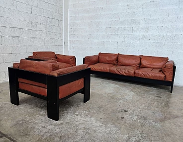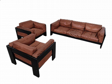 Bastiano three-seater sofa and pair of armchairs by Afra and Tobia Scarpa for Gavina, 1960s. Black lacquered wood structure and brown leather upholstery. Gavina, about this design, said he was "exploiting Le Corbusier's idea of free cushions to make a modern sofa," but this time using wood.