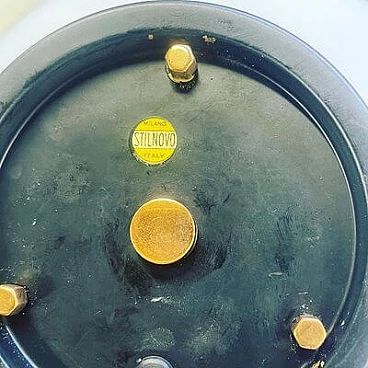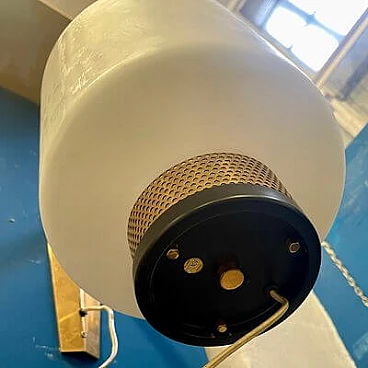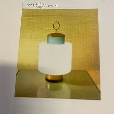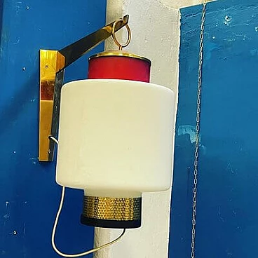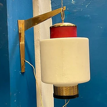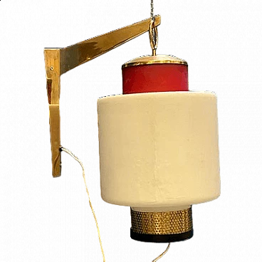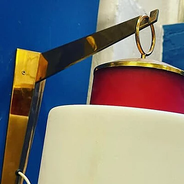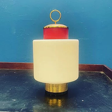 Table lamp model 852. This lamp features a main shade of red and white frosted glass accompanied by patinated brass elements. The orientalist 'lantern' shape, together with the brass bracket, lends itself perfectly to various uses, both as a wall and table lamp. Under the base is an original Stilnovo sticker. Bibliography: 'Stilnovo lighting fixtures' Luminaires-Moderniste p. 134 stilnovo model 8052 year 1958.