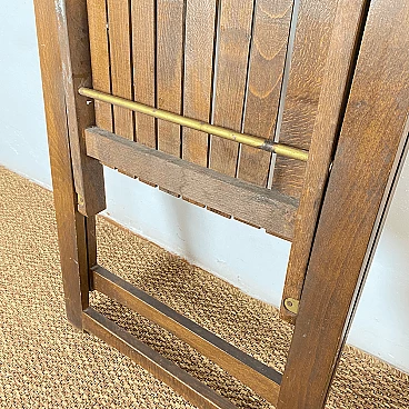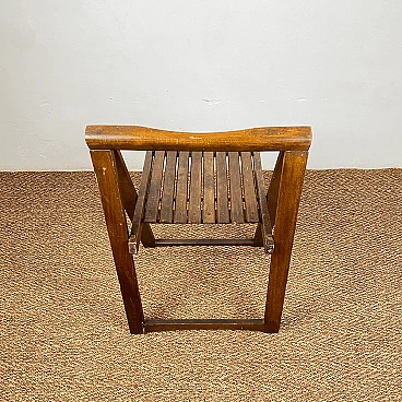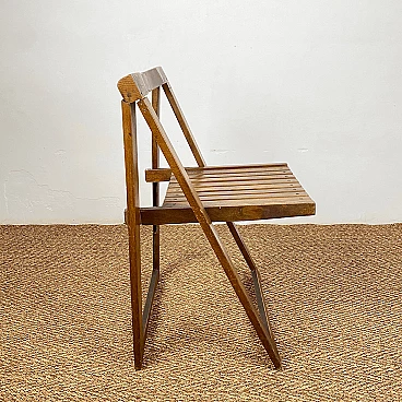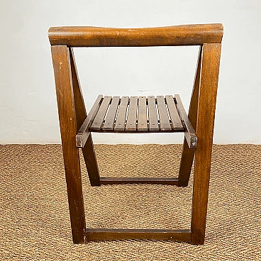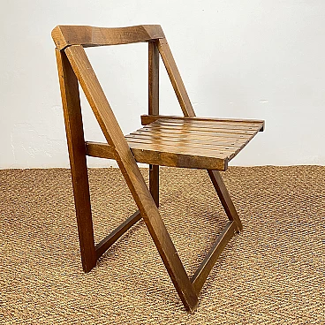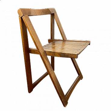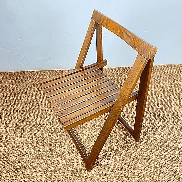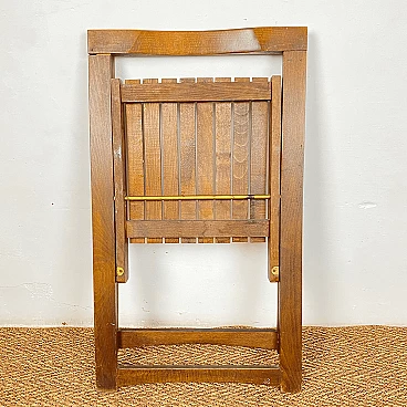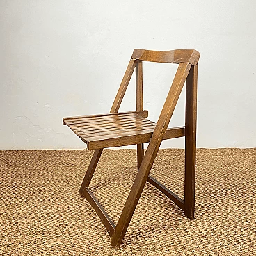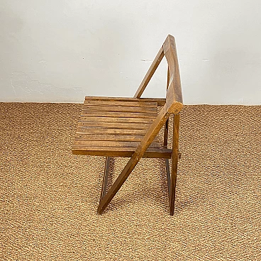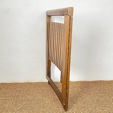 Beautiful classic design by the Italian architect Aldo Jacober produced by Alberto Bazzani in 1966. Geometrical and functional folding chair in solid beech. Very comfortable, it is in very good condition. Beautiful dark, worn wood patina, the chair hinges are brass. Used with small traces of use and signs of age (see photo). Total width 36 cm, total height 77 cm, total depth 36 cm, seat height 42 cm.
