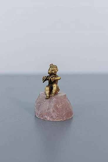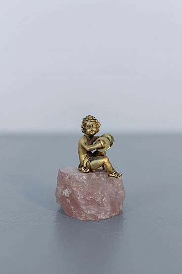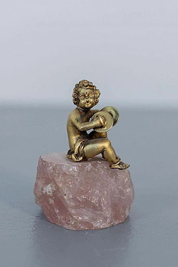 Splendid silver statuette depicting a cherub from the Baroque period, late 18th century. The statue is made entirely of gilded silver and depicts a musician cherub holding two cymbals. The cherub is seated on a rose quartz stone of great elegance and charm. The statue is suitable for decorating important halls as well as for musicians and collectors of Baroque art. On the back of the cherub is the 800 mark attesting to its silver craftsmanship.