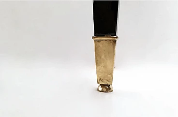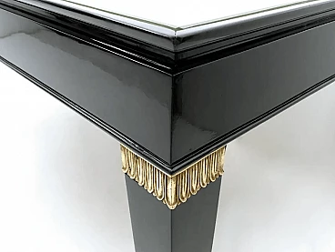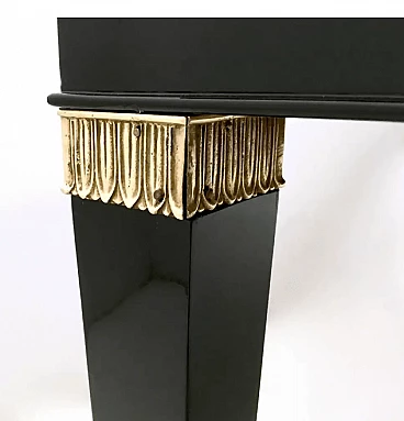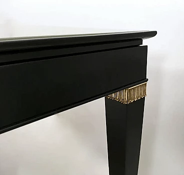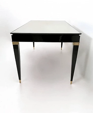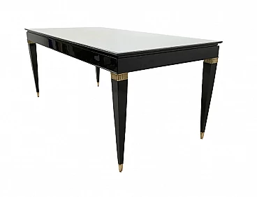 Black lacquered beech table with brass feet and details and dove gray back-painted glass top. As this is a vintage item, it may have minor traces of use, but can be considered in excellent original condition and ready to become a home piece.
