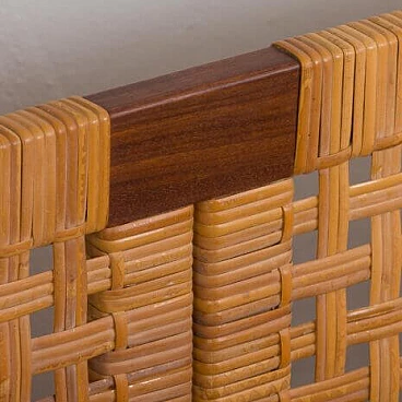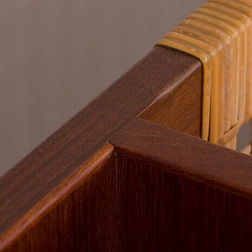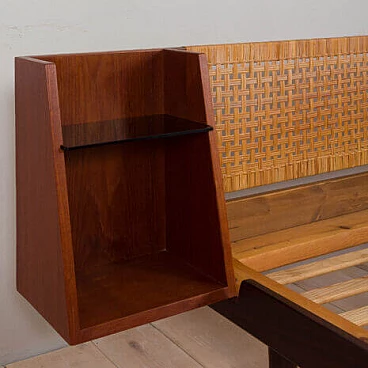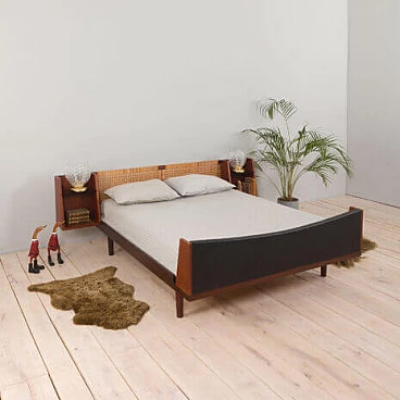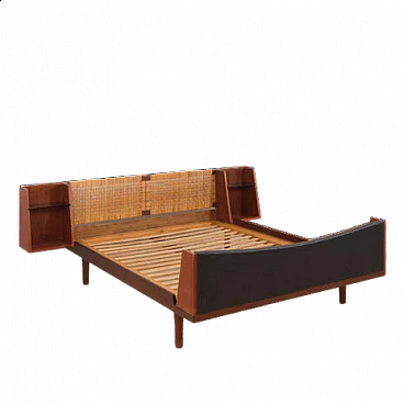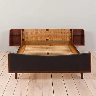GE 701 bed by Hans Wegner for Getama, made in Denmark in the 1960s. Teak veneered wood structure, woven cane headboard, black leatherette footboard. The structure incorporates two suspended wooden bedside tables with removable black glass shelves. Mattress dimensions (not included): 193 x 150 cm.