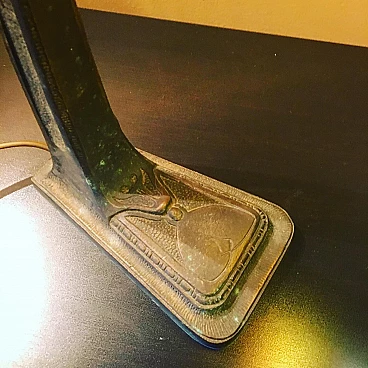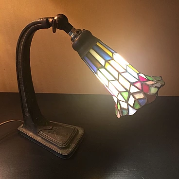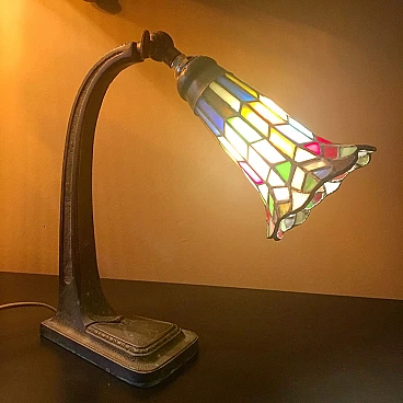 Liberty table lamp / Art Nouveau Bronze base decorated with floral motif. Corolla lampshade in multicolored glass welded with lead. New electrical system Shipment to be agreed