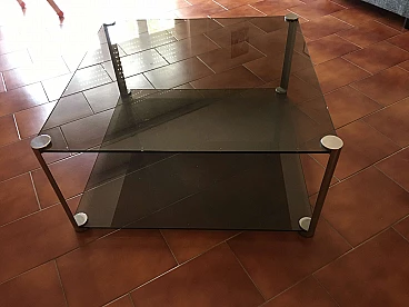 For sale: Space Age coffee table from the 1970s. This piece of furniture was produced in Italy in the 1970s, undoubtedly designed by a great designer who unfortunately cannot be identified among the many who created during that period. Chromed steel frame and smoked glass shelves. TV stand of the same model also available.