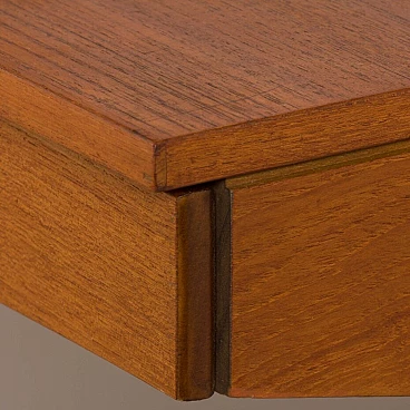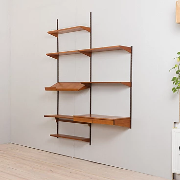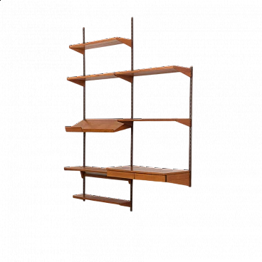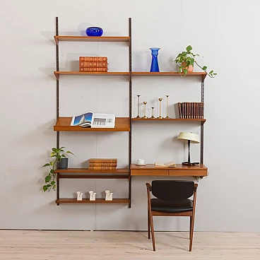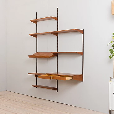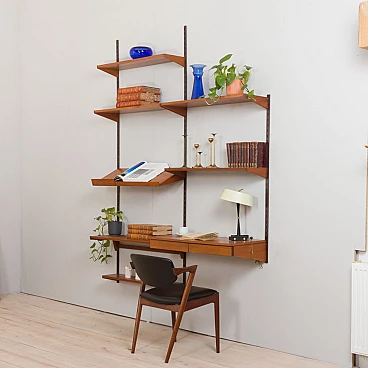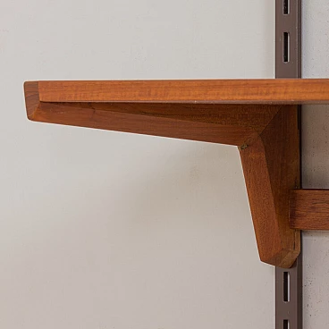 Elegant vintage Danish bookcase with floating teak desk, designed by Kai Kristiansen in the 1960s and produced by FM Mobler, validated by the manufacturer's label. Six shelves of varying depths and a display shelf, combined with a comfortable desk, create a convenient home office space with functional storage for books and decorations. Ideal for a living room or bedroom. The wall unit features brilliant joinery and rich teak grain. A great example of Danish carpentry skills from the mid-20th century. This set consists of one 18 cm deep shelf; two 24 cm deep shelves; two 28 cm deep shelves; one 32 cm deep shelf; one 32 cm deep display shelf; one desk H: 16 / W: 86 / D: 40 cm, drawer height 5 cm; three metal rails, two 223 cm long and one shorter 126 cm long.