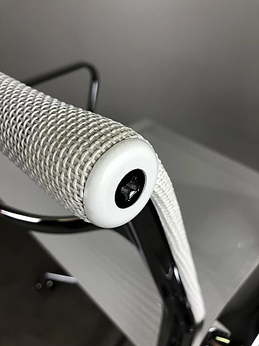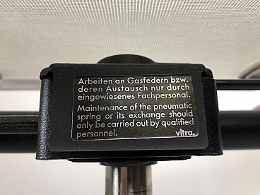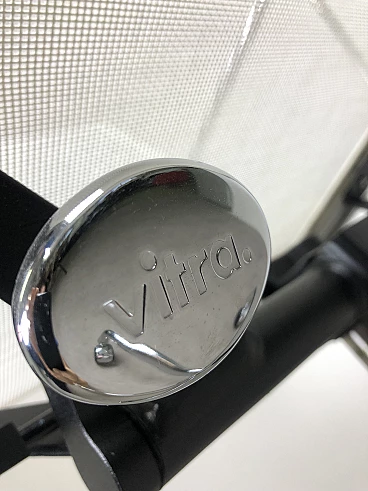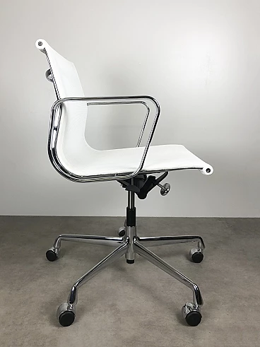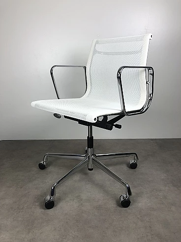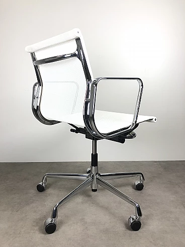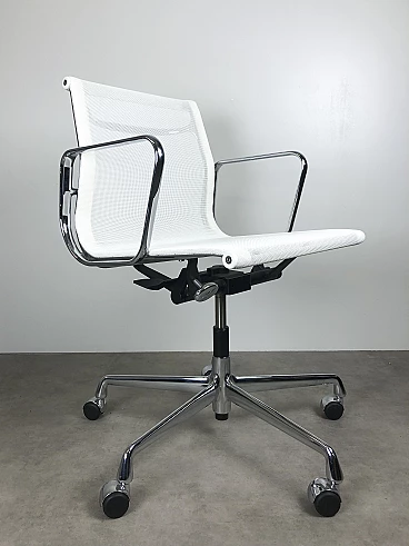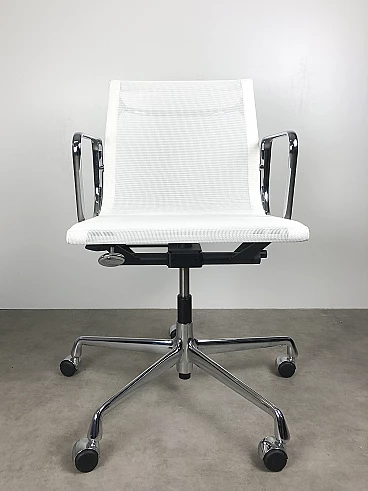EA118 armchair from the Aluminium Group collection designed by Charles & Ray Eames for Vitra. Swivel armchair with adjustable height and reclining backrest. Chromed aluminum structure, white mesh material seat and backrest.