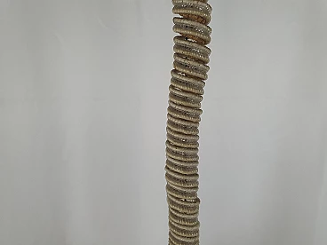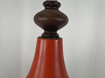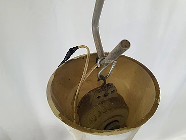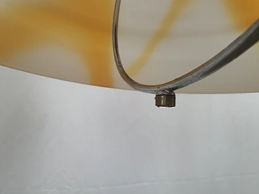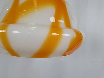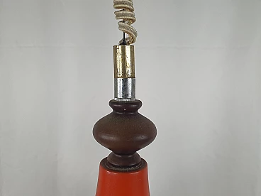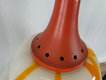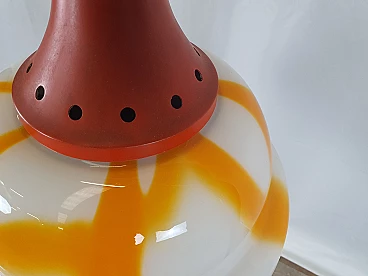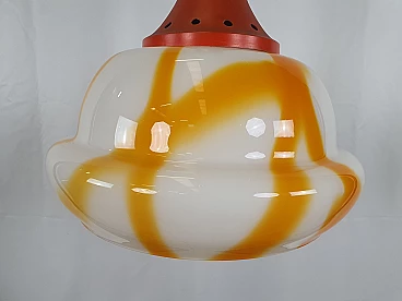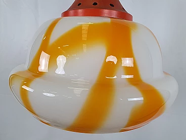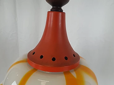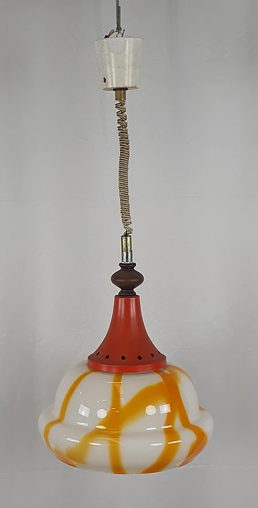 Modern chandelier in white and orange coloured glass from the early 1970s of Italian manufacture. Iron and wood stand. Suitable for kitchens, living rooms and large halls. Shows normal signs of age and use. Replacement of electrical parts and/or wiring recommended.