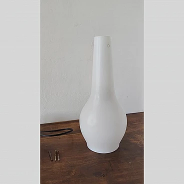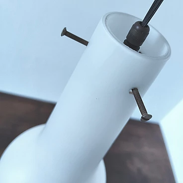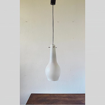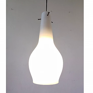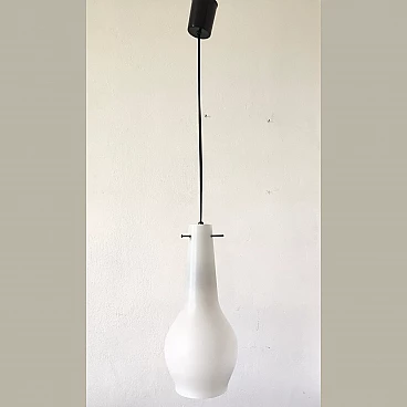 White opaline glass hanging lamp, 1950s. Black plastic canopy. Of the three brass elements used to lock the light diffuser only one is original, the other two have been replaced with screws of the same length. It needs an E27 40W bulb. Overhauled electrical system. Total height: 90 cm. Height wire and canopy excluded: 36 cm.