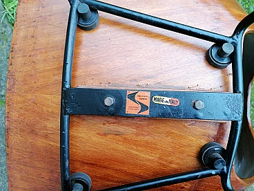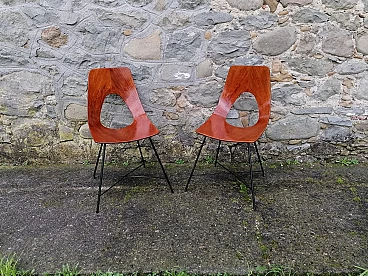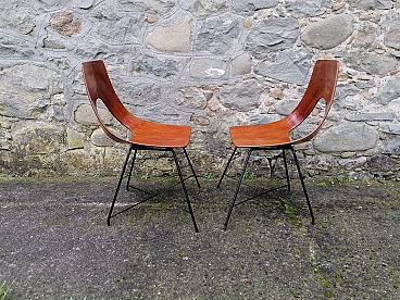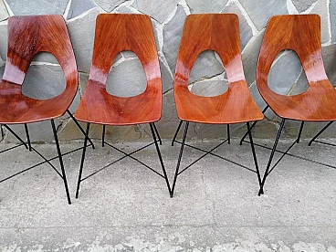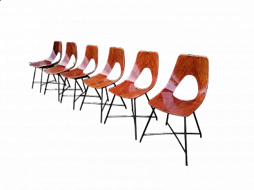 Six Ariston model dining chairs with curved plywood frame and black lacquered metal legs. The Ariston chair was designed by Augusto Bozzi and produced by Saporiti in the 1950s. The manufacturer's label is visible under the frame of the chair. The chair is made of a piece of plywood bent into an elegant shape with a very clean line. The wood has a warm reddish undertone. The wooden frame is supported by a thin, black lacquered metal spider base, which gives the chair a light and elegant appearance. Augusto Bozzi was an Italian designer. In the late 1940s, he started designing his iconic chairs and armchairs and in 1950 he began a collaboration with the Italian furniture manufacturer Saporiti Italia to produce his designs. In the 1950s, Augusto Bozzi and Sergio Saporiti, the founder of Saporiti, worked together with designers Alberto Rosselli and Giorgio Raimondi to create designer objects and furniture with essential designs and innovative materials.
