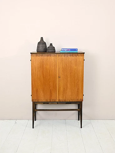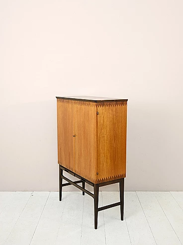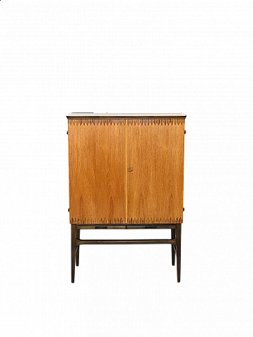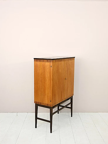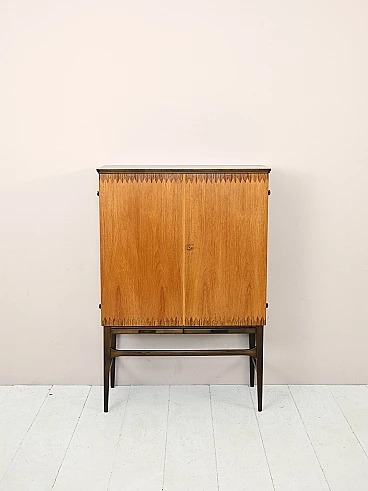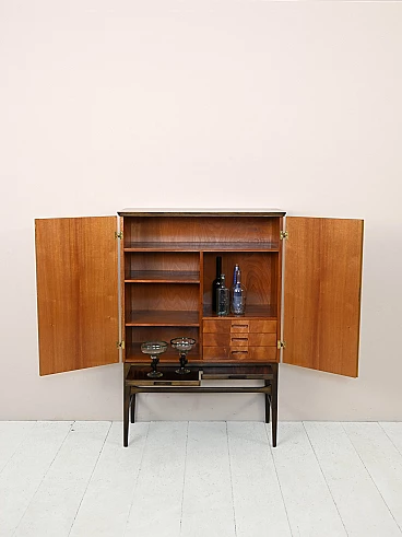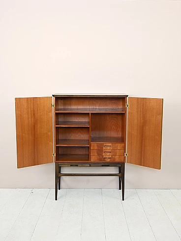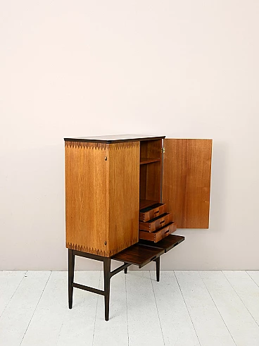 Original Scandinavian-made cabinet from the 1950s. Bar cabinet in teak and rosewood with hinged doors. Inside the cabinet we find three drawers and various support shelves, under the doors there are two retractable shelves useful as a support surface. Good conditions. A conservative restoration was done with products of natural origin. May show signs of aging. Please pay attention to the photographs.