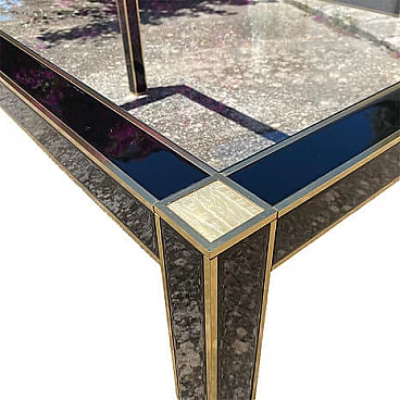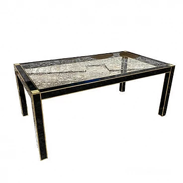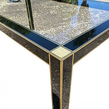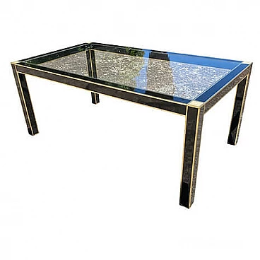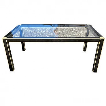 Table by Pierre Cardin for Roche Bobois, late 1970s. Black lacquered wood structure with glass top, brass borders and mother-of-pearl details on the corners. This table cannot be disassembled.