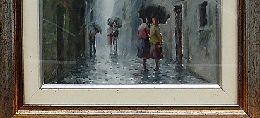 Onelio Romanello, urban glimpse with rain, oil painting on canvas