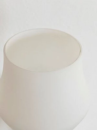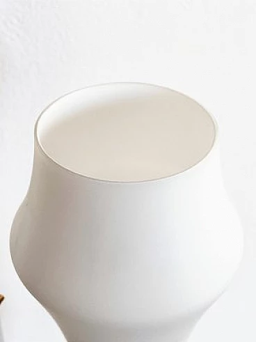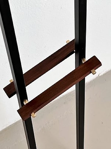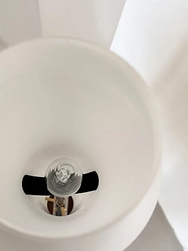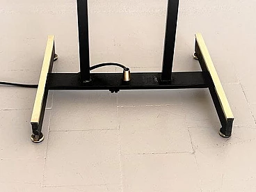 The base of the lamp is in painted metal, with wooden parts and brass details. The two long milky-white glass diffusers are mounted with a spring and hold a small candelabra bulb (E14) each. The metal, brass and wood parts have been polished and are in very good vintage condition. Rewired with black fabric cable and European plug. The floor lamp is in very good vintage condition, no defects.
