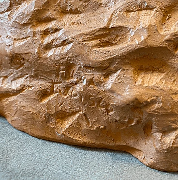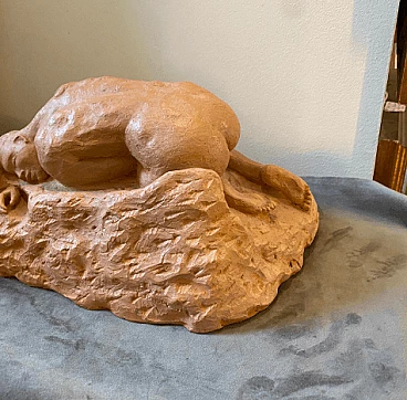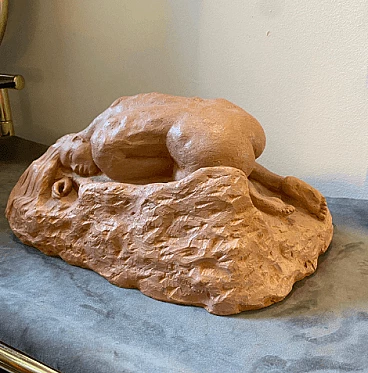 Sicilian terracotta sculpture by Tudisco depicting a nude female figure lying on the ground, 1970s. Signed on one side. Terracotta is a type of clay-based ceramic material that has been used extensively throughout history for sculptural works. It is noted for her earthy reddish-brown color and its ability to depict intricate details. The choice of subject matter and nudity reflects artistic expressions of beauty, sensuality but also vulnerability. It is important to take into account the Sicilian origin, a region that has been influenced by various cultures and artistic movements, including the Greek, Roman and Baroque styles.