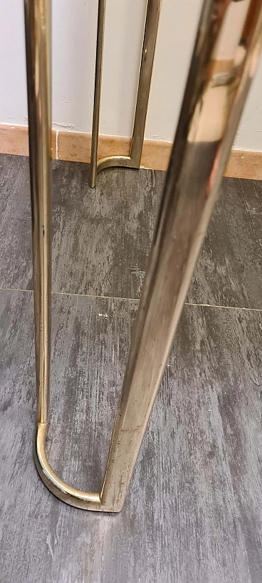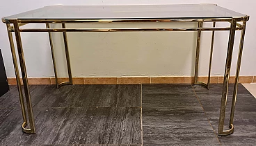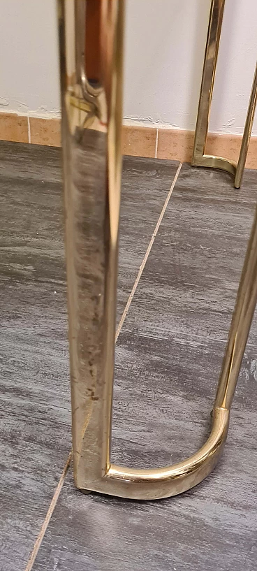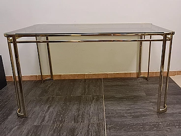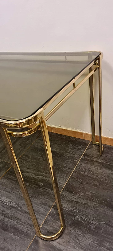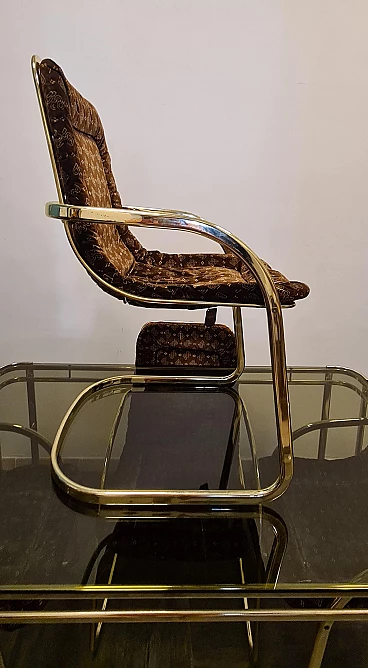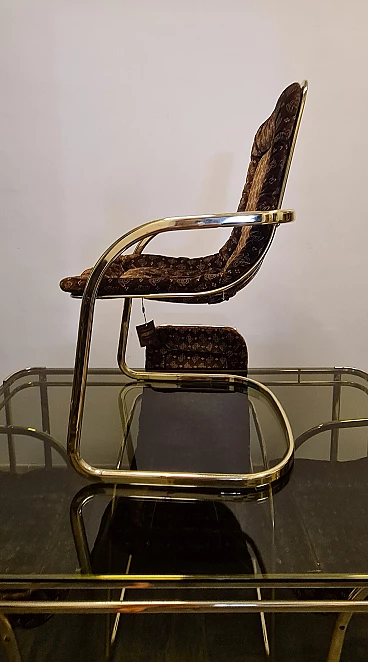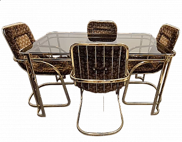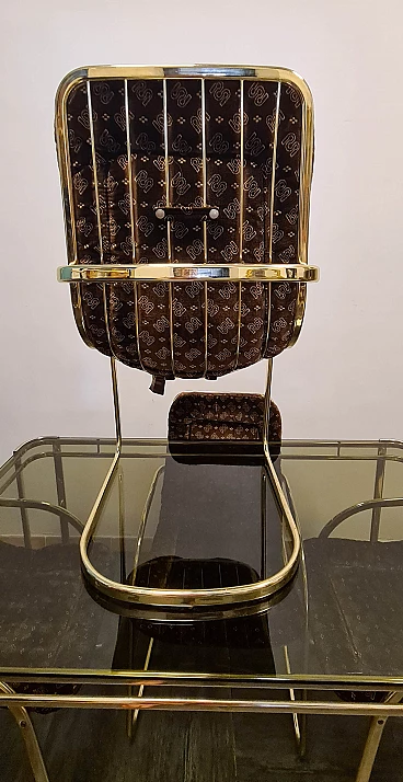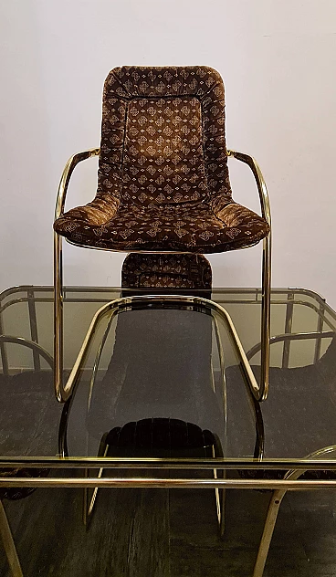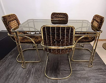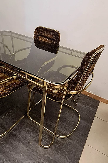 Table with four chairs in gilded metal by Morex offers you an elegant option for furnishing your home or office. Morex was founded in 1973 and has since then been Europe's leading manufacturer of metal furniture. This high quality set is made of gold-plated metal, the galvanised gold metal is a great way to ensure an elegant and refined yet light brass effect in contrast to the glass top, it will add a touch of class and style to your environment. The four chairs with brown velvet seats are designed to offer you maximum comfort. With their sturdy backrests and comfortable seats, these chairs will allow you to sit for a long time without tiring. You can gather the whole family or friends around the table for pleasant dinners, gatherings or simply to spend quality time together. The set dates from the 1970s and is in very good condition, as can be seen from the photos, it has a slight patina due to age, the seats of the chairs are in mint condition, one seat has suffered a small patch as can be seen from the photos. The chairs still have the original Morex label. The design of this set is elegant and versatile, suitable for different styles of furniture. The polished brass offers a touch of luxury, while the clean, modern lines fit perfectly into contemporary settings. Whether you prefer a classic style or a more contemporary look, this set will perfectly suit your personal taste.