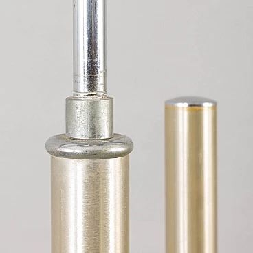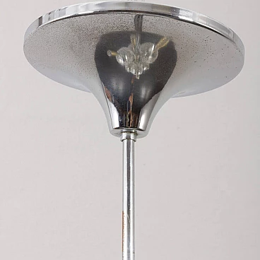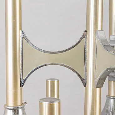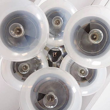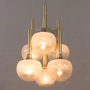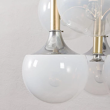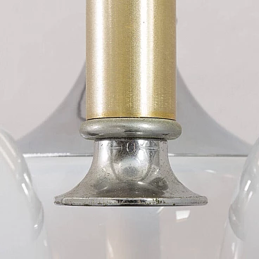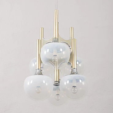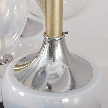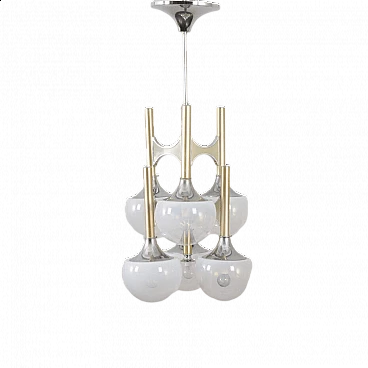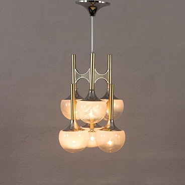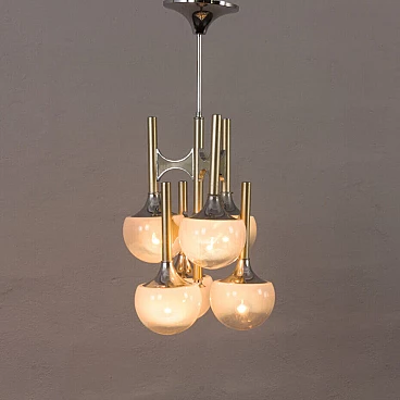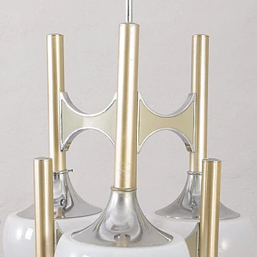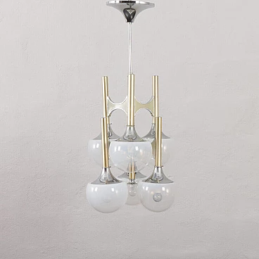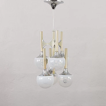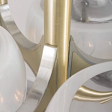 This mid-century Italian chandelier designed by Gaetano Sciolari in the early 1970s is a piece of art and beauty. It combines chrome and brass-plated steel with milk-white Murano glass 'Lattimo' lampshades. So-called 'lattimo' is a special glass processing and the term is derived from the Italian word for 'milk'. The glass is half white and gradually becomes transparent. This vintage chandelier features six light sources with Murano glass shades. The vertical fixture is crowned by a large chrome canopy. This wonderful chandelier is a real eye-catcher that produces a magical light when illuminated. It will enrich any interior with a touch of mid-century Italian design. Our team has meticulously inspected and verified the lamp. It is in fantastic original vintage condition, with minor scratches and patina stains. Requires E27 bulbs.
