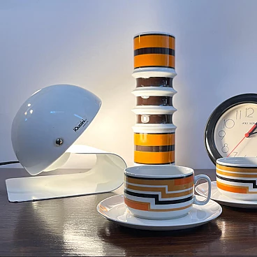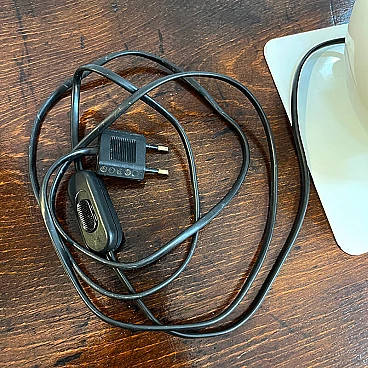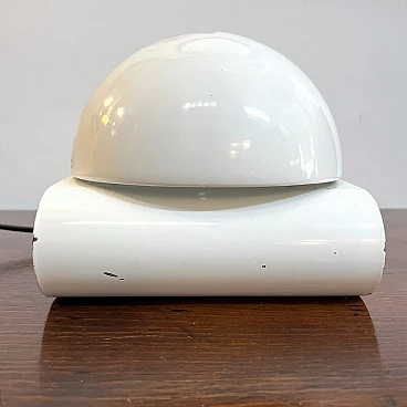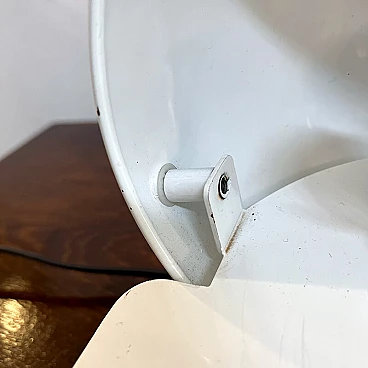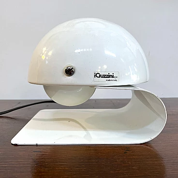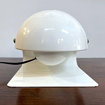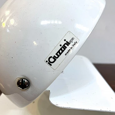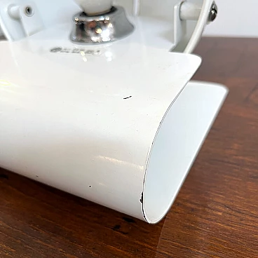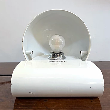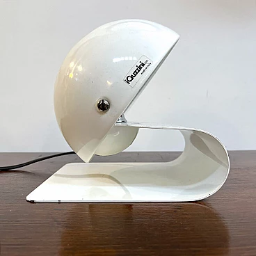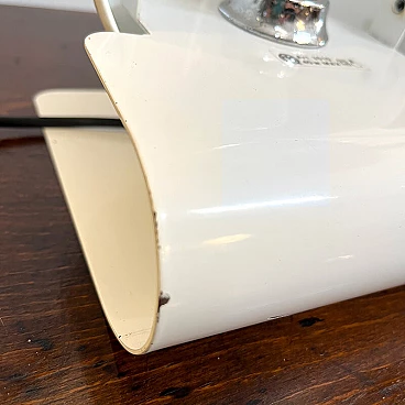 Bugia lamp by iGuzzini in white curved metal (original paint). Bugia is a bedside lamp designed by Giuseppe Cormio in 1976 and went into production the same year. It consists of a metal support that acts as a base, on which a metal cap with adjustable inclination is hinged. It is thus possible to shield or guide the light emitted by the source in a certain direction. The curved support and the metal cap with adjustable inclination give it an attractive and curious design, an echo of the Italian space age style. On the side you can see the vintage sticker with the trademark 'iGuzzinis spa made in Italy'. Excellent vintage condition (see photo). The electrical system is the original one and has been professionally checked. The lamp has a few small marks from use (see photo in detail).