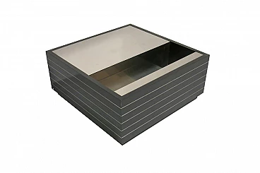 Grande tavolino basso anni '70, con struttura in legno scuro squadrata con piano e decorazioni a strisce cromate e completo di un grande scomparto sul piano. Buone condizioni vintage.