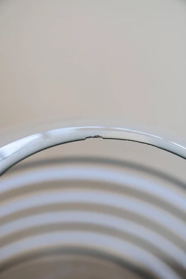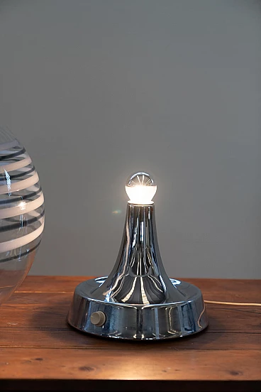 Spherical table lamp by Gino Vistosi in chromed metal and Murano glass, 1970s. Murano glass blown by hand by Vistosi's masters. This particular glass globe is complex to make because of its size and the use of two types of glass. Complex glass designs can take up to seven experts to make. The glass globe is hand-marked "Vistosi". It has some small chips around the opening (which is invisible when placed on the base). Fully functioning. Light wear due to age and use. European socket (up to 250V).