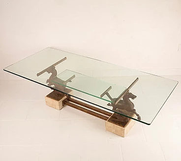This coffee table is an authentic work of art, characterized by two bronze horses placed on a travertine base and connected by an elegant bronzed rod. With a double glass top, this unique piece is in impeccable condition and is the rarest version of this coffee table, making it a valuable addition for collectors and lovers of vintage design. Materials: bronze, travertine, crystal.