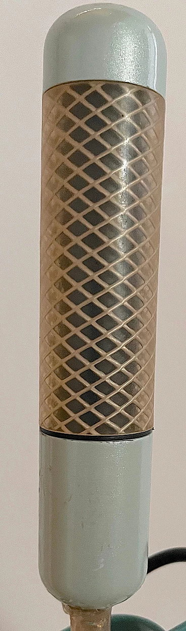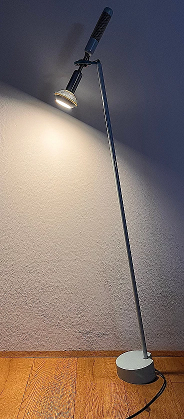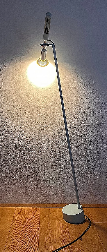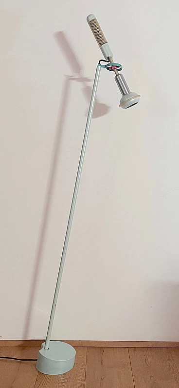 Grip floor lamp by Achille Castiglioni for Flos, 1980s (designed in 1985). It is a special floor light fixture, ideal for reading. From a painted steel base, a rod rises slightly tilted in the air and ends with a kind of protruding gimbal joint. This two-tone "gyroscope" connects, on its own axis, two strongly characterized elements and allows the orientation of the light source according to individual reading needs. Below, a "microphone" houses the bulb, shielded and focused to provide adequate light. Diametrically opposite, a "knob" (formed by a plastic-coated tube) ends with a rotary snap switch, which is offered as an object to be held with one hand, to orient, naturally, the light beam in the most appropriate way. In good condition with some scratches on the base. E14 bulb socket (bulb provided in the sale).
