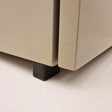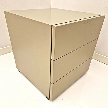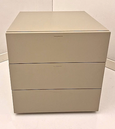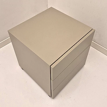 The pair of bedside tables proposed is part of the 909 series that Luca Meda designed for Molteni & C. in 1991, reinventing chests of drawers and bedside tables between rationality and tradition. The simple and functional design creates a product with cubic dimensions of 48.5 x 48.5 x 48.5 cm in which three drawers with push-pull opening are inserted. The ideal pressure point is marked on the front panels with an almost invisible line of reddish metal. Great care was taken in creating the finish: a satin grey-dove lacquer defines the two products offered.