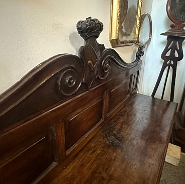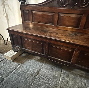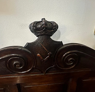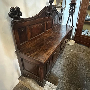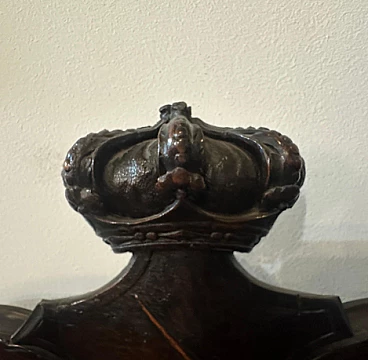 One of a kind walnut bench, which belonged to the noble Sicilian Spatafora family. It is a piece of furniture that reflects the characteristics of the Louis Philippe style, which established itself in the mid-19th century during the reign of Louis Philippe I of France. This style is known for its understated elegance and emphasis on comfort. The bench is crafted from high quality walnut and has been polished to give a rich, warm finish. It features the Spatafora family coat of arms on the top. It is in very good condition, considering its use and age. Seat height: 52 cm.