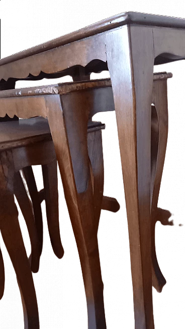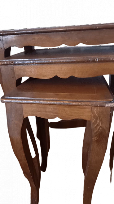 Three wooden coffee tables. Large table h 58 cm, w 49 cm, d 29 cm. Medium table h 52 cm, w 38 cm, d 25 cm. Small table h 44 cm, w 25 cm, d 25 cm.