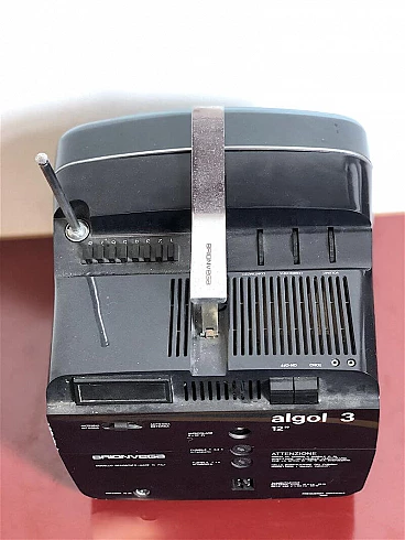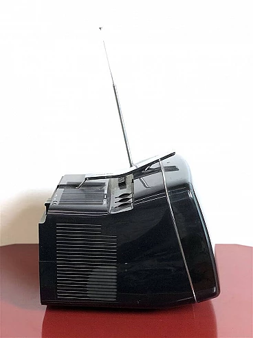 The ALGOL 3 (First series) is an unusual 11-inch portable transistor television. In 1964 Marco Zanuso and Richard Sapper designed this Brionvega transient television model Algol 3 and marketed by the Milanese company Brionvega. It is characterized by the rounded and inclined screen (for this very reason Zanuso will compare it to a little dog looking up at its owner) and the removable metal handle. The device is made of BLACK ABS plastic material with beveled edges. The kinescope has a 90° deflection to allow easier viewing. In the upper part there are the operating controls for switching on, adjusting the volume, brightness and contrast, and selecting the pre-selected VHF and UHF channels. On the back of the television there are sockets for connecting to the mains, the internal rechargeable battery, the VHF and UHF channels, for an external speaker and the antenna selector. The ALGOL 3 is a global icon of industrial design, it is exhibited in the most important contemporary art museums, even the MoMa in New York houses an example. In perfect working order, there are some small signs caused by age. The TV needs to be tested as the power cable is missing.