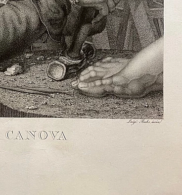 Luigi Rados (Parma 1773 - Milan 1844) Italian painter and engraver. He trained in Milan at the Brera Academy, specialising in engraving techniques and producing portraits of his contemporaries, often half-length and three-quarter-length. He worked on engraving views and genre scenes and designed headpieces, friezes and vignettes for the official acts of the Cisalpine Republic. The sheet depicts the sculptor Antonio Canova (Possagno 1757 - Venice 1822) from a drawing by Roberto Focosi (Milan 1806 - 1862). The sculptor is portrayed standing half-length facing slightly to the left. In the studio he is surrounded by sculptures, one can recognise in the background the bust of Pope Pius VII completed in 1804 and now in Versailles, the Damosseno commissioned by the papal government for the Vatican Museums and completed in 1806, Domenico Marchetti's engraving plate depicting the detail of the Beneficence in the Funeral Monument of Christina of Austria in Vienna completed in 1811, a bearded man's head possibly copied from the antique Jupiter, and finally behind him a drawing in which we recognise the plan of the Canovian Temple in Possagno. Canova rests his hands on a sculptor's mallet, looking at a sculpture he is working on, only the right foot is visible, it could be that of the Ajax completed in 1812. Rados' dotted technique enhances the details of the face and the elegance of the dress. Bottom right engraved: Luigi Rados engraved, left: Roberto Focosi drew, title in open letters in the centre. Specimen in working proof and letter aventi, before the dedication to Febo d'Adda Vice President of Government and before the signs filling the letters of the title in the bottom centre as in the specimen preserved in the Davoli 26158 collection. Excellent impression. Very good state of preservation, traces of handling. Margins of one centimetre on three sides, trimmed at the stop in the lower margin. Dry stamp not decipherable.
