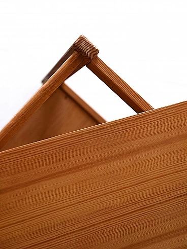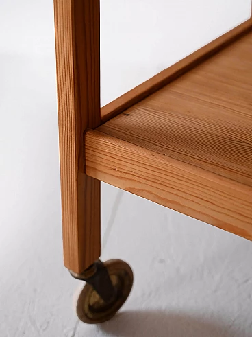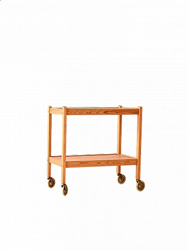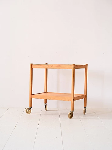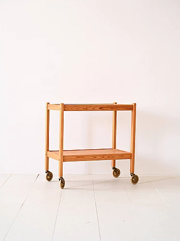 Scandinavian pine cart/side table with wheels, 1960s-70s. A cart with minimal lines and modern taste that can also be used as a side table for the living room. The presence of the two tabletops and wheels makes it a practical and functional piece. The light-colored wooden top structure with marked grain gives it an original look that is suitable to be combined with contemporary-style furniture.