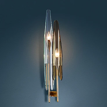 Wall lamp from the 'Dahlia' series in zapponato brass, coloured, curved and ground crystal. 1950s-60s, circa 1954. In excellent original condition.