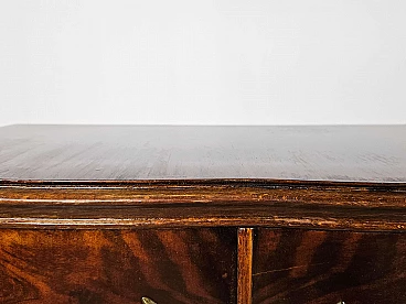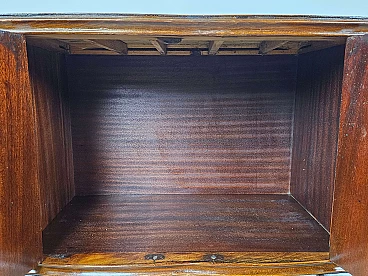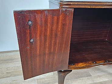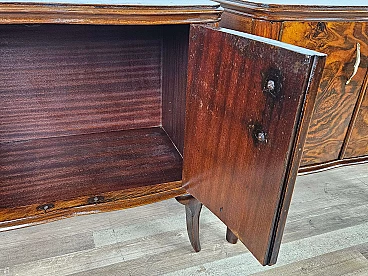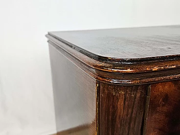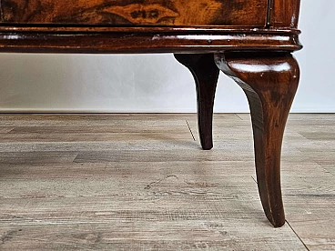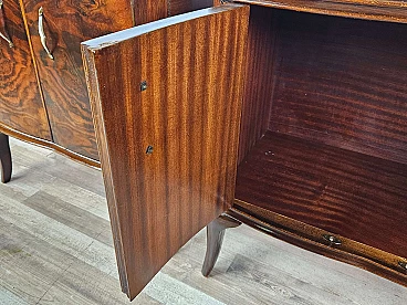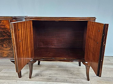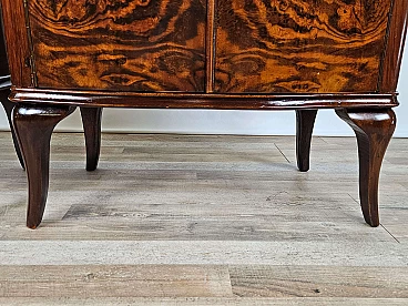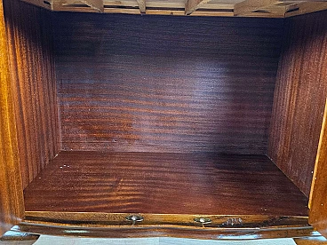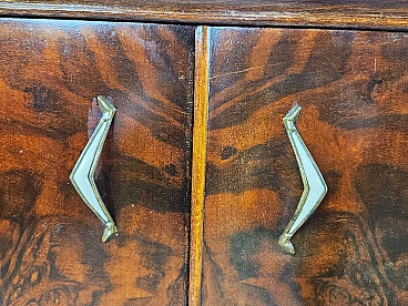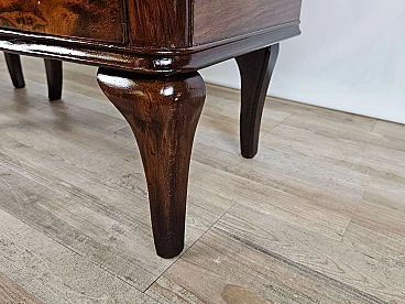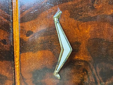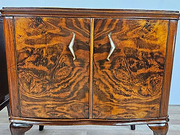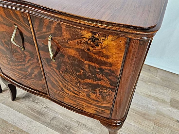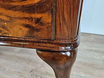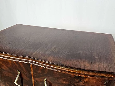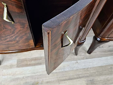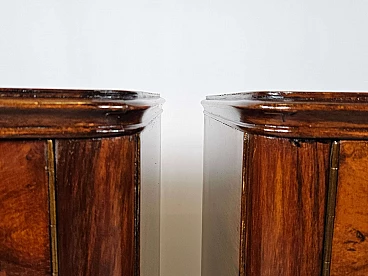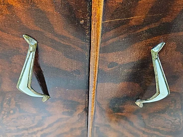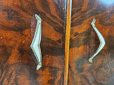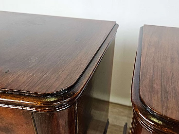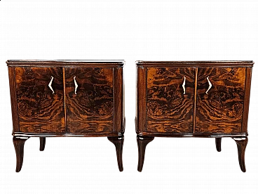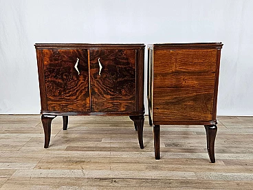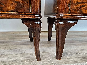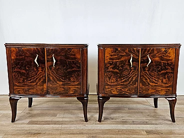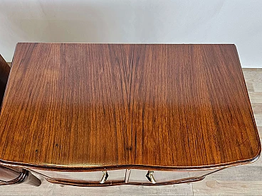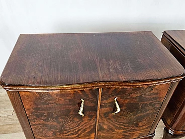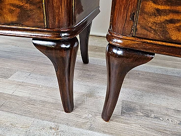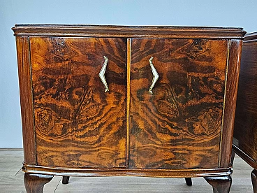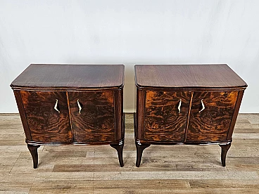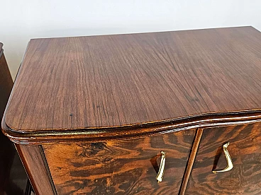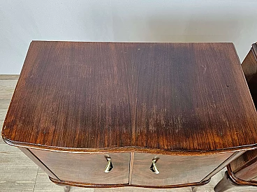 Pair of walnut bedside tables with brass handles and wavy legs, 1950s